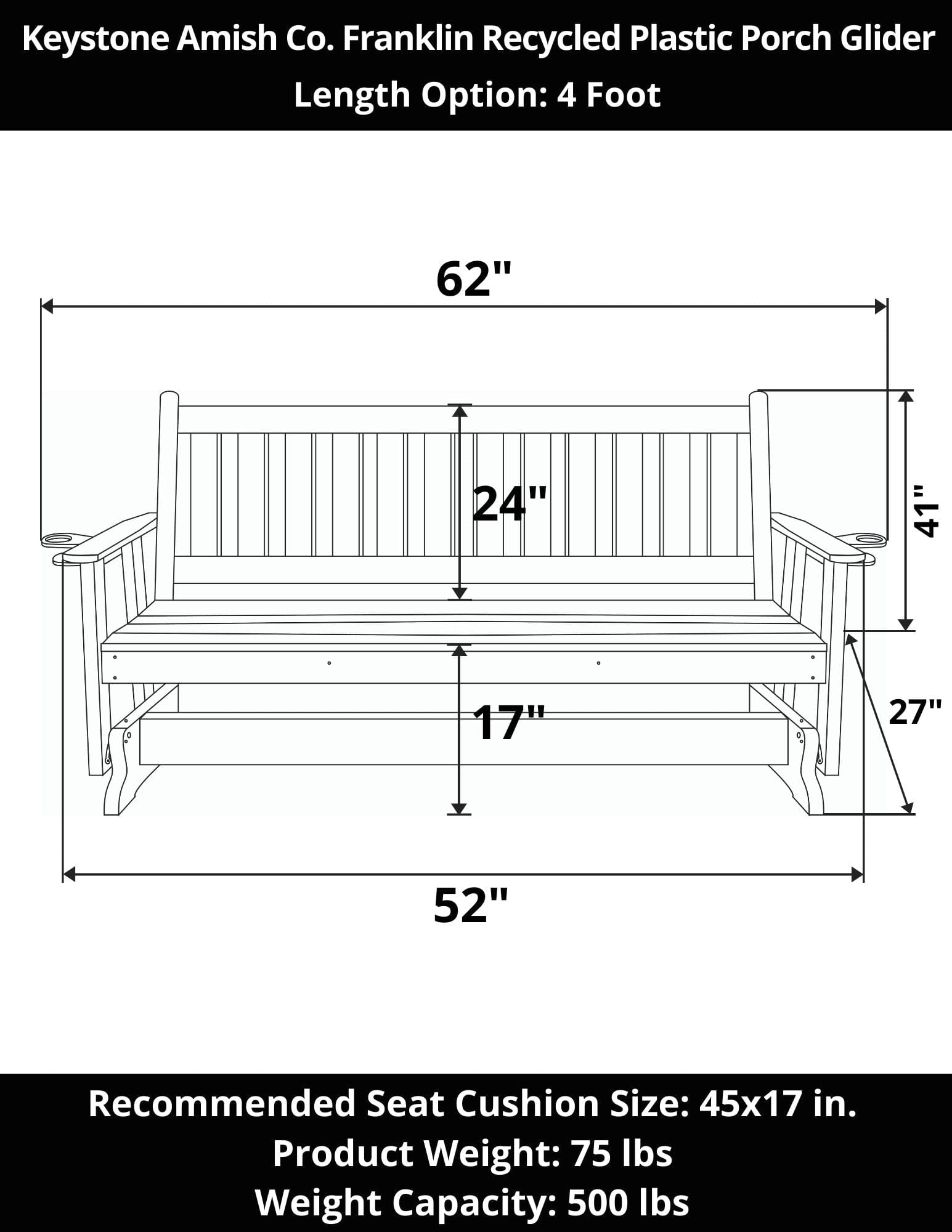 The Keystone Amish Co. Franklin Poly Composite Porch Glider is expertly crafted by Amish artisans for a classic design that's built to last. Made from recycled plastic and featuring stainless steel hardware, this sturdy outdoor glider requires minimal maintenance. With a smooth gliding motion and a 10-year warranty, it's the perfect addition to any porch or patio.