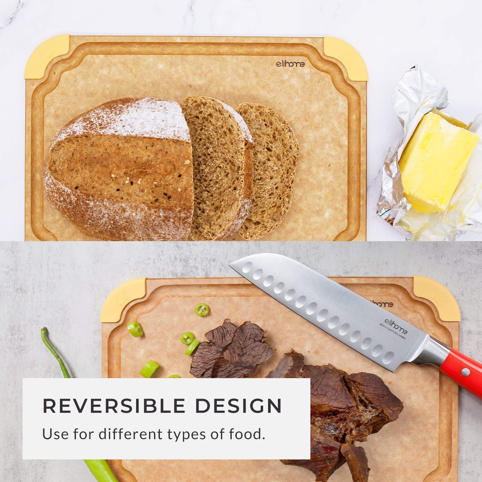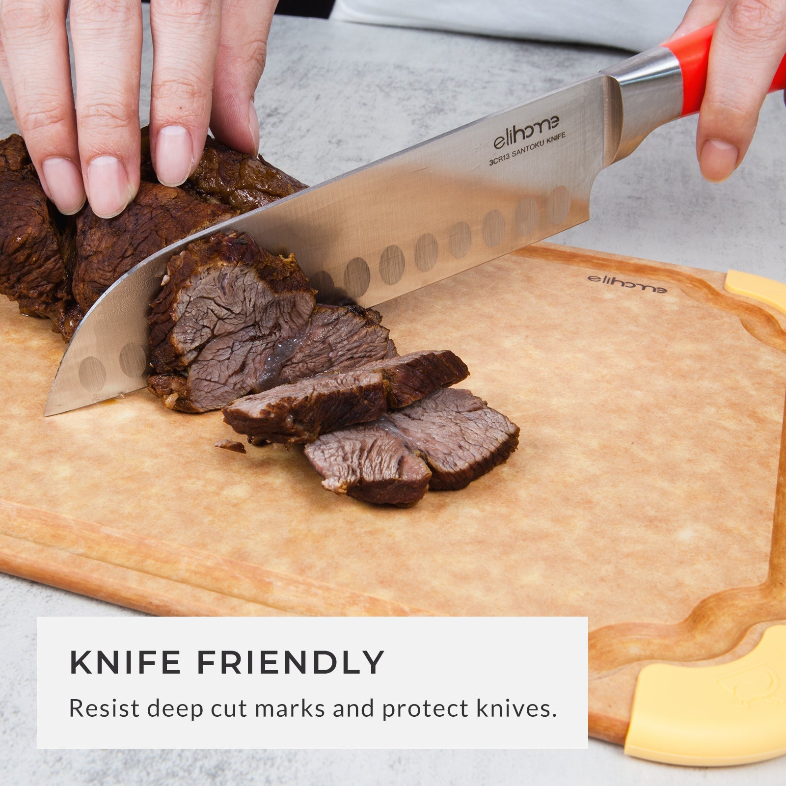 The non-porous, ultra-strong cutting surface is gentle on knives, ensuring durability while resisting stains and odors. It is tough enough for slicing, dicing, and sharp knives yet easy to clean for long-term use.