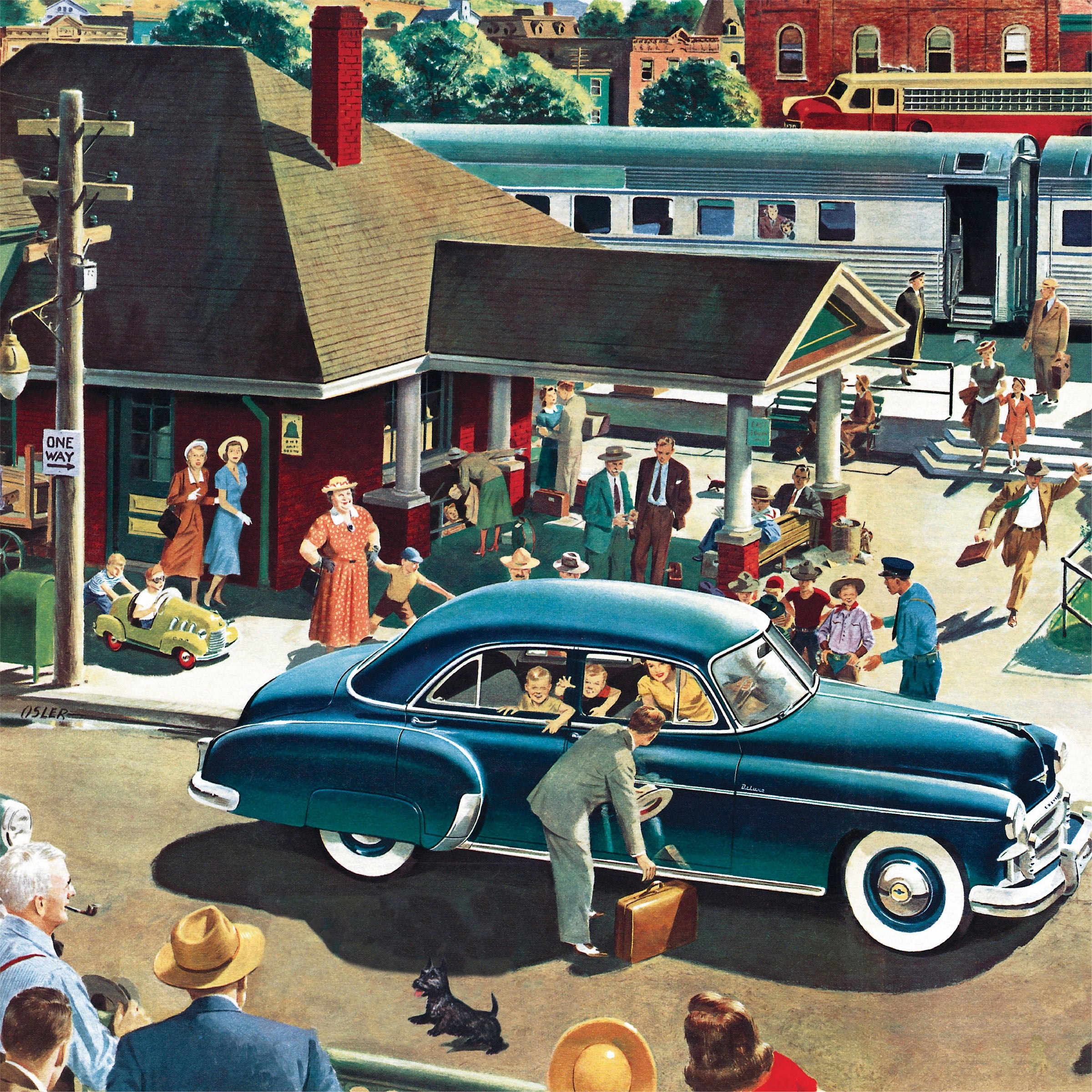 Amidst the bustling train station, a vintage Chevy stands as a timeless centerpiece, exuding its classic charm. Commuters and travelers bustle around, a whirlwind of people coming and going, each catching a glimpse of the alluring vintage car.