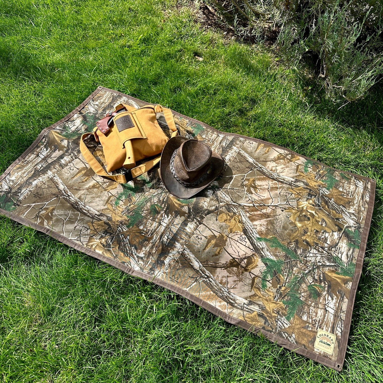 For the Bushcrafter, cabin owner, outdoors-man, or nature lover that has it all, we have created the ultimate functional ground cloth.  Hang it and use it as art, or better yet, use it for its purpose.  This ground cloth is made from 10.1 oz brown waxed canvas, but also features a Realtree Xtra camouflage lining.  And, because it can easy be waxed to have the same durability and water resistance as the waxed canvas it is attached to.  The lining does not come waxed, but we'd be more than happy to share how to do it, if you want to.