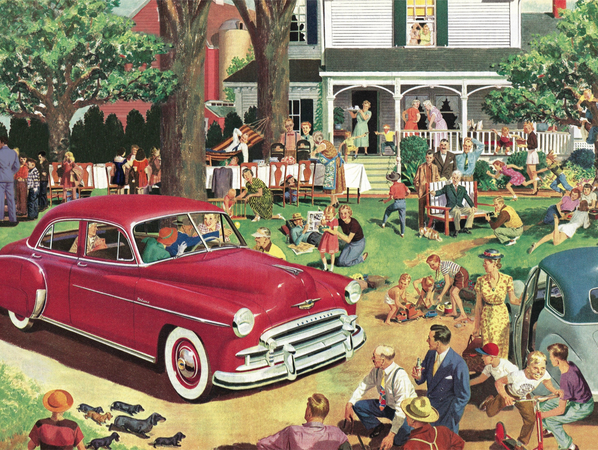 Take part in this busy scene as generations gather for a summer family reunion featuring a classic Chevrolet.