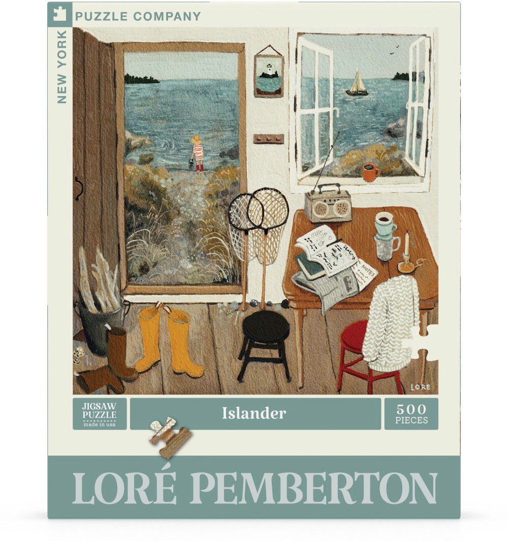 Step into a tranquil seaside retreat with Islander, a 500-piece puzzle capturing the essence of coastal life. This serene scene by artist Loré Pemberton invites you into a cozy cottage entryway, where fishing nets, tall rain boots, and driftwood gather near an open window. Through the doorway, a sailboat glides by as a woman stands along the shoreline, basking in the calm of the sea. With its inviting details, this puzzle is perfect for anyone who loves the quiet beauty of nautical life and makes a wonderful gift for the holidays.