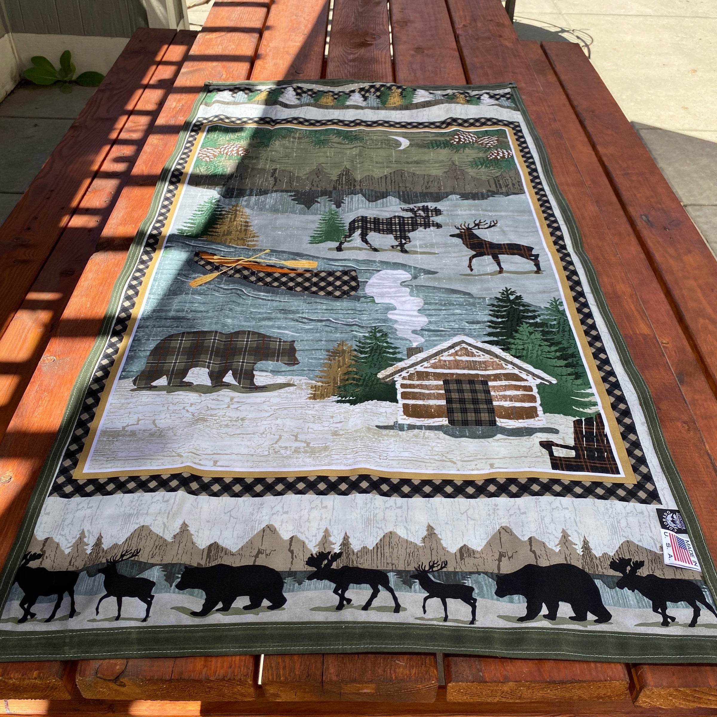 For the Bushcrafter, cabin owner, outdoorsman, or nature lover that has it all, we have created the ultimate functional vintage artwork ground cloth.  Hang it and use it as art, or better yet, use it for its purpose.  This ground cloth is made from 10.1 oz waxed canvas, but also features a 100% cotton lining with what we feel is the perfect scene for the bushcraft community.  And, because it is 100% cotton, it can easy be waxed to have the same durability and water resistance as the waxed canvas it is attached to.  The cotton lining does not come waxed, but we'd be more than happy to share how to do it, if you want to.